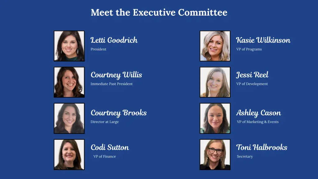 Leadership roles include the following: President, Immediate Past President, Director at Large, Vice President of Finance, Vice President of Programs, Vice President of Development, Vice President of Marketing & Events, and Secretary. There is also a “School Board Liaison”, and the Superintendent of the District is a non-voting member as well.